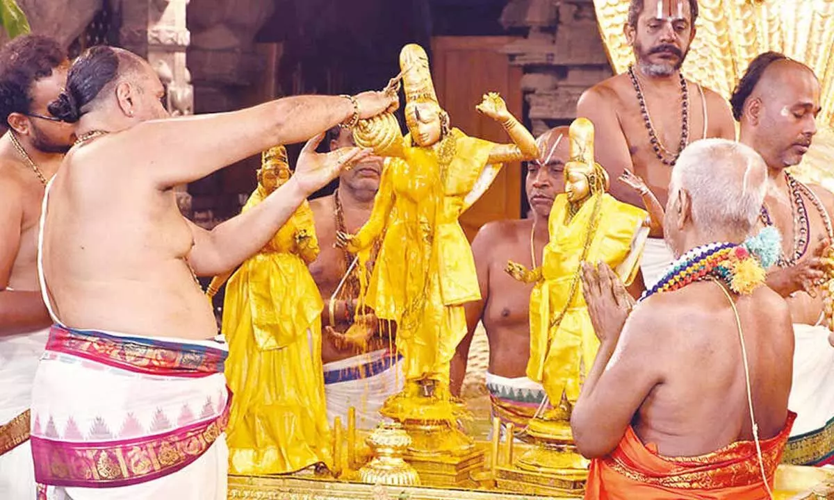 At Tirumala, the sacred Snapana Tirumanjanam was performed to the Utsava deities of Sri Sita, Lakshmana and Anjaneya sametha Sri Ramachandra Swamy as part of the festivities. The deities were seated on a specially arranged platform at the Ranganayakula Mandapam inside the Srivari temple. Tirumala Pedda Jeeyar Swamy, TTD Executive Officer M Ravichandra, Additional EO Ch Venkaiah Chowdary, and other officials participated in the ceremony.