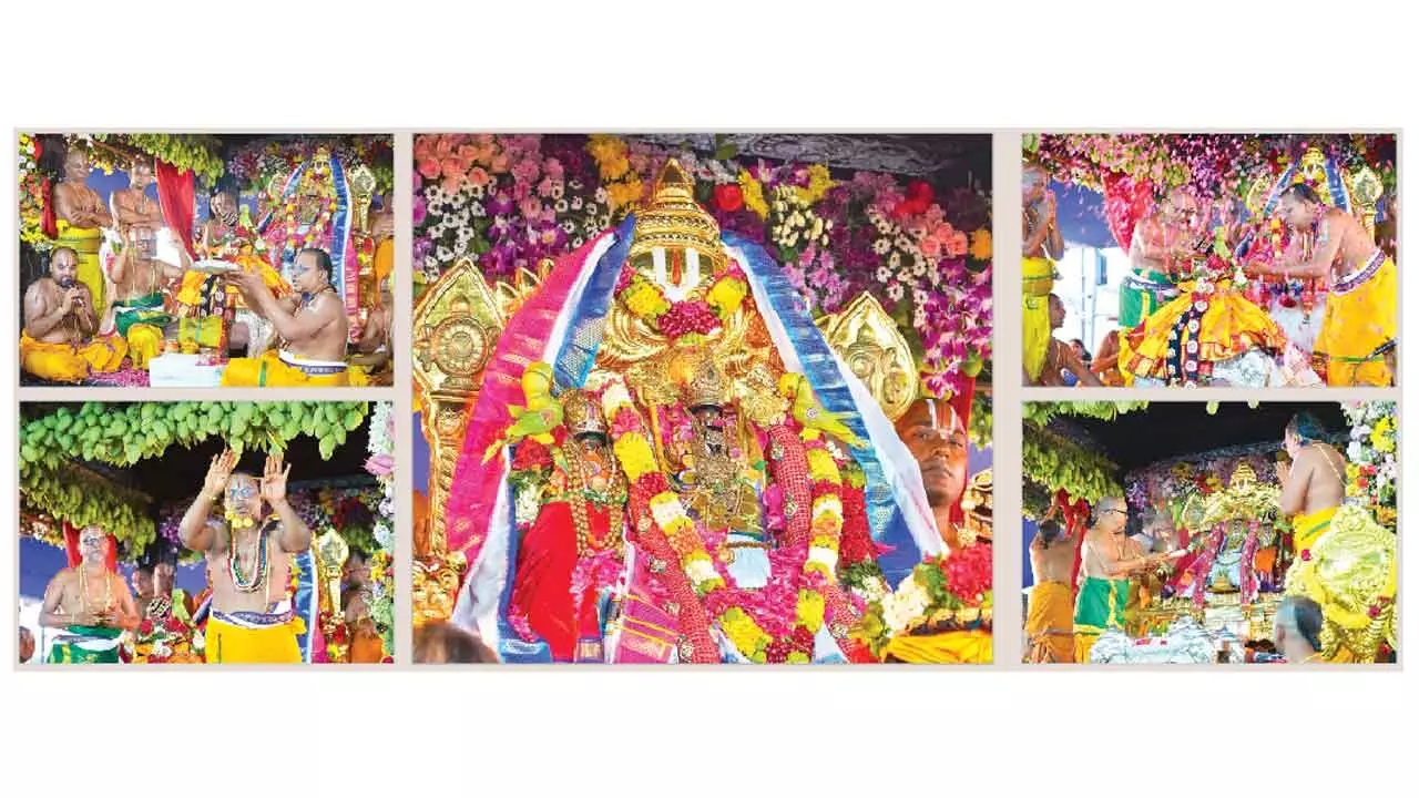Amid a spiritually charged atmosphere, the divine couple was symbolically united in wedlock at noon in the flower-decked kalyana mandapam set up at Mithila Stadium in the temple town