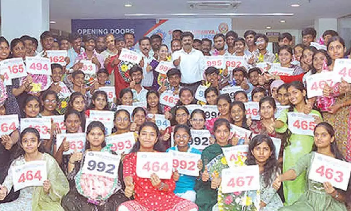 In Second Year(MPC), B. Shashikumar, K. Maithri, U. Charu Hasini secured 995 marks . BiPC stream, B Lahari and O Srinivasan got 994 marks each.